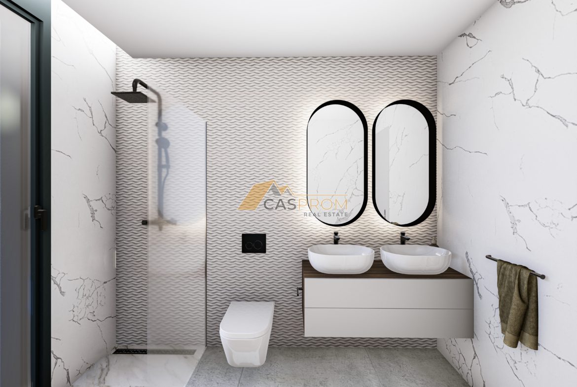 Łazienki wyposażone są w zawieszane sanitariaty, brodziki z efektem deszczownicy, umywalki nablatowe z szafką oraz szklane kabiny prysznicowe. Willa posiada preinstalację klimatyzacji kanałowej, system wentylacji mechanicznej, aerotermiczne ogrzewanie wody (100L) oraz instalację fotowoltaiczną z 6 panelami (550W) i falownikiem Huawei.