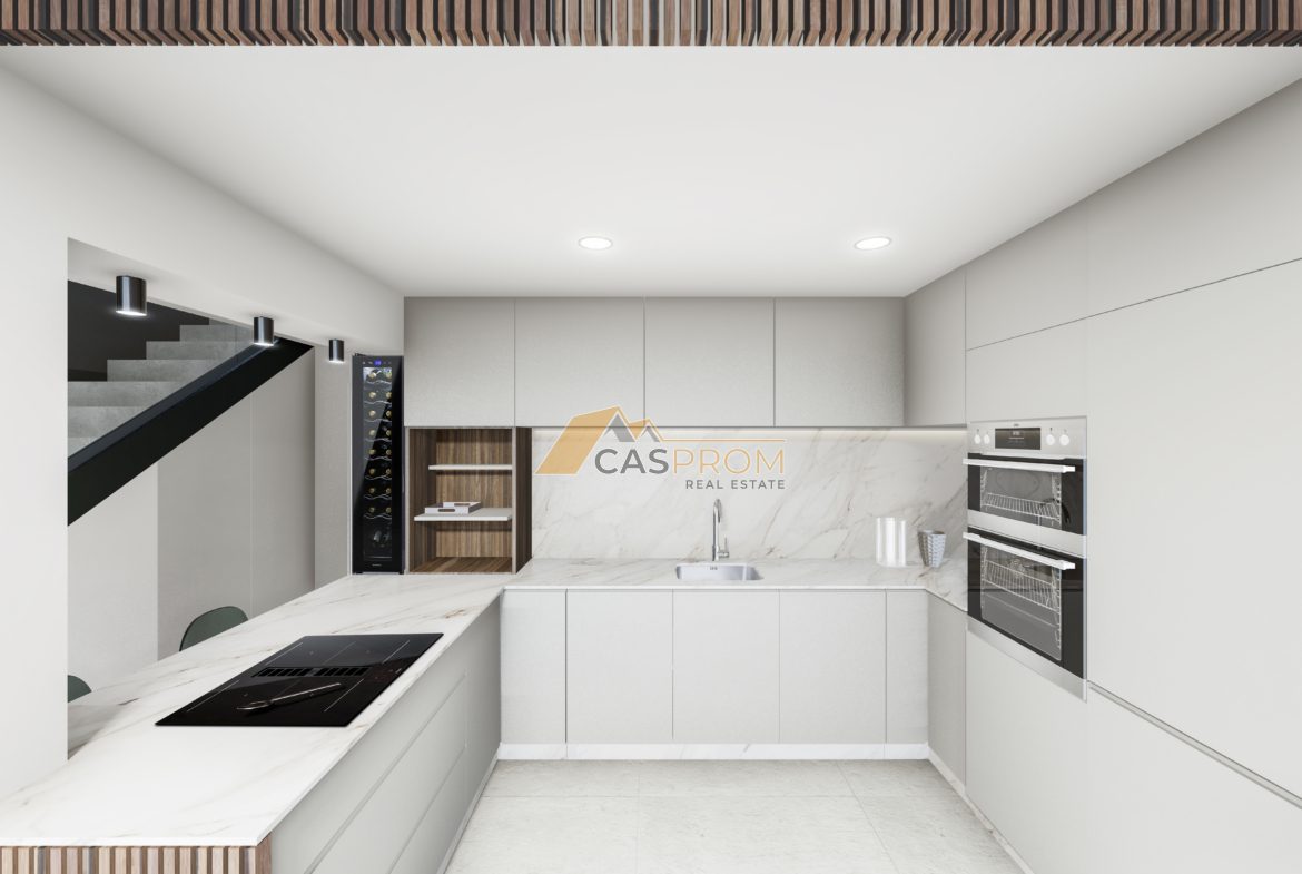 Wnętrza nieruchomości zostały wykończone w wysokim standardzie – porcelanowe podłogi, ściany pokryte gładką białą farbą, lakierowane na biało drzwi wewnętrzne oraz zabudowane szafy z systemem cichego domyku. W kuchni zastosowano meble z lakierowanego MDF z systemem „push”, blat i panel z kompozytu Silestone, a w wyposażeniu znajdują się sprzęty Siemens lub podobnej klasy: płyta grzewcza, piekarnik, mikrofalówka, okap, lodówka, zmywarka i chłodziarka na wino.